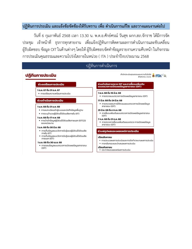วันที่ 6 กุมภาพันธ์ 2568 เวลา 13.00 น. พ.ต.อ.ศักย์ศรณ์ วันสุข ผกก.สภ.จักราช จัดประชุมหัวหน้าสายงาน และเจ้าหน้าที่ธุรการทุกสายงาน เรื่องการเผยแพร่หรือเสริมสร้างความรู้ความเข้าใจให้เจ้าหน้าที่ในการจัดการทรัพย์สินของราชการ ของบริจาค และการจัดเก็บของกลางเพื่อป้องกันการทุจริตภายในหน่วยงาน  พร้อมแต่งตั้งคณะทำงาน ขับเคลื่อน และกำกับติดตามการประเมิน ITA ประจำปีงบประมาณ 2568 ของสถานีตำรวจภูธรจักราชขึ้นมาและมีการจัดเรียกประชุมเพื่อวางแนวทางใน กิจกรรม และวางแผนเพื่อให้ได้ข้อมูลครบถ้วนถูกต้องและติดตามผลงาน การดำเนินการเป็นประจำ พร้อมชี้แจงปฏิทินการดำเนินงาน ประจำปีงบประมาณ พ.ศ.2568
